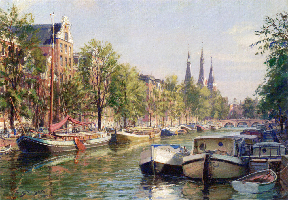 This view down the Herengracht was chosen as it encompasses the variety of small craft mixed in with gracious Dutch barges, many converted to residences; the canal side architecture and the plane trees giving a dappled sunlight over all.