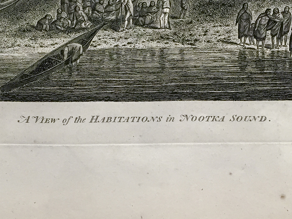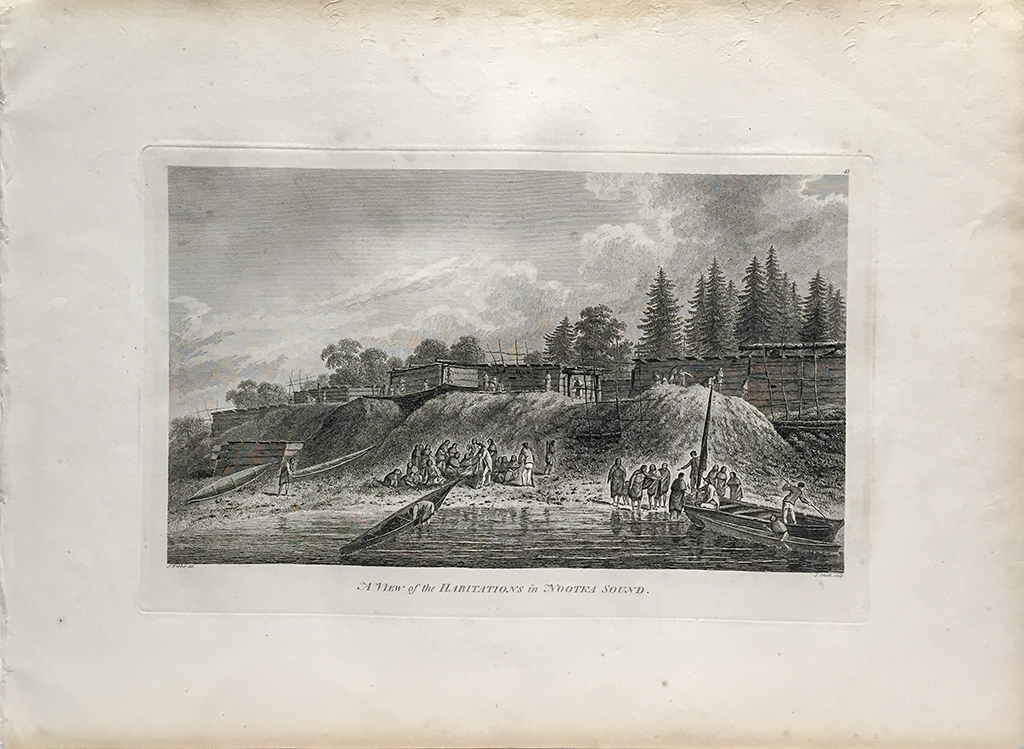 ‘A View of the Habitations in Nootka Sound’ We have acquired a large collection of more than 40 of the original 61 plates and 2 maps which were published in the first edition of Captain Cook’s account of his voyages in the South Pacific in 1784. These plates were purchased by one of our collectors who obtained the entire folio from an antiquarian book/map dealer several years ago. They fit the guidelines of the engravings which were created for the first edition, as each leaf measures 23″ x 17″ and the paper is of the period. Many of the leaves show light rips, tears and the occasional paper loss around the edges. These are perfect for framing, as nearly all of the engravings are clean and bright.