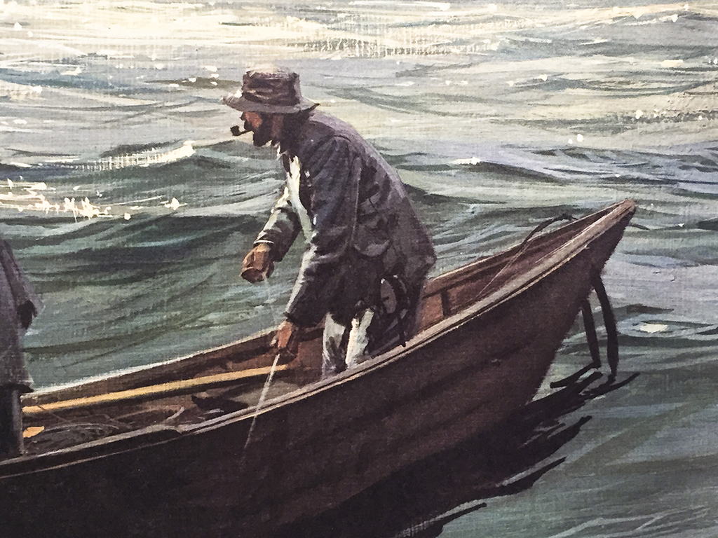 A haddock schooner built in Essex, Massachusetts by Oxner and Story in 1902, The Ellen C. Burke, which sailed out of Boston, is shown here heading back to market in 1910 after a good catch on the “Banks”, that group of underwater islands or shallows that stretch from Nantucket east past Nova Scotia and Newfoundland almost a thousand miles toward Europe. For the trip home, her dories are visible stacked and lashed on deck.
