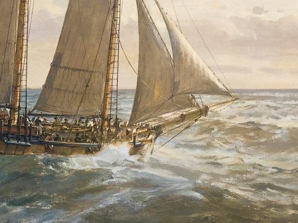 From Geoff Hunt’s spectacular series of prints depicting dramatic naval actions associated with the War of Independence and the War of 1812. Continental Army schooners raiding British supply ships off Cape Cod, March 1776. Encamped outside Boston in 1775, General Washington’s forces outnumbered the British trapped within the city. But the British commanded the sea, and Washington could see their supply ships going to and fro as they pleased. There was no Continental Navy to stop them.