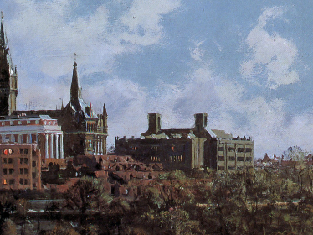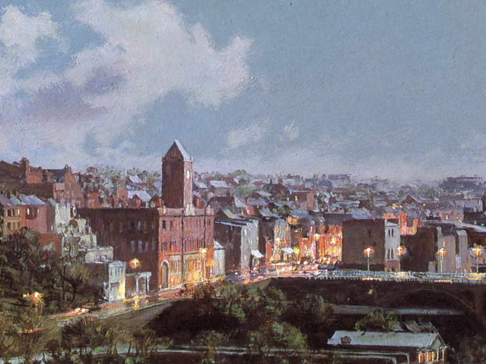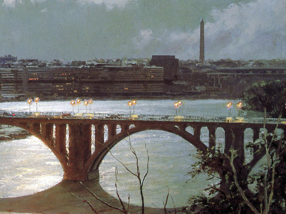 A contemporary view from the high banks of the Potomac River looking southeast to the Key Bridge. To the left is the Georgetown University campus on the hill.