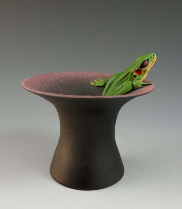 Wheel thrown porcelain with hand carved frog motif. Air brushed matte glazes applied in multiple coats, fired to maturity in an oxidation kiln.