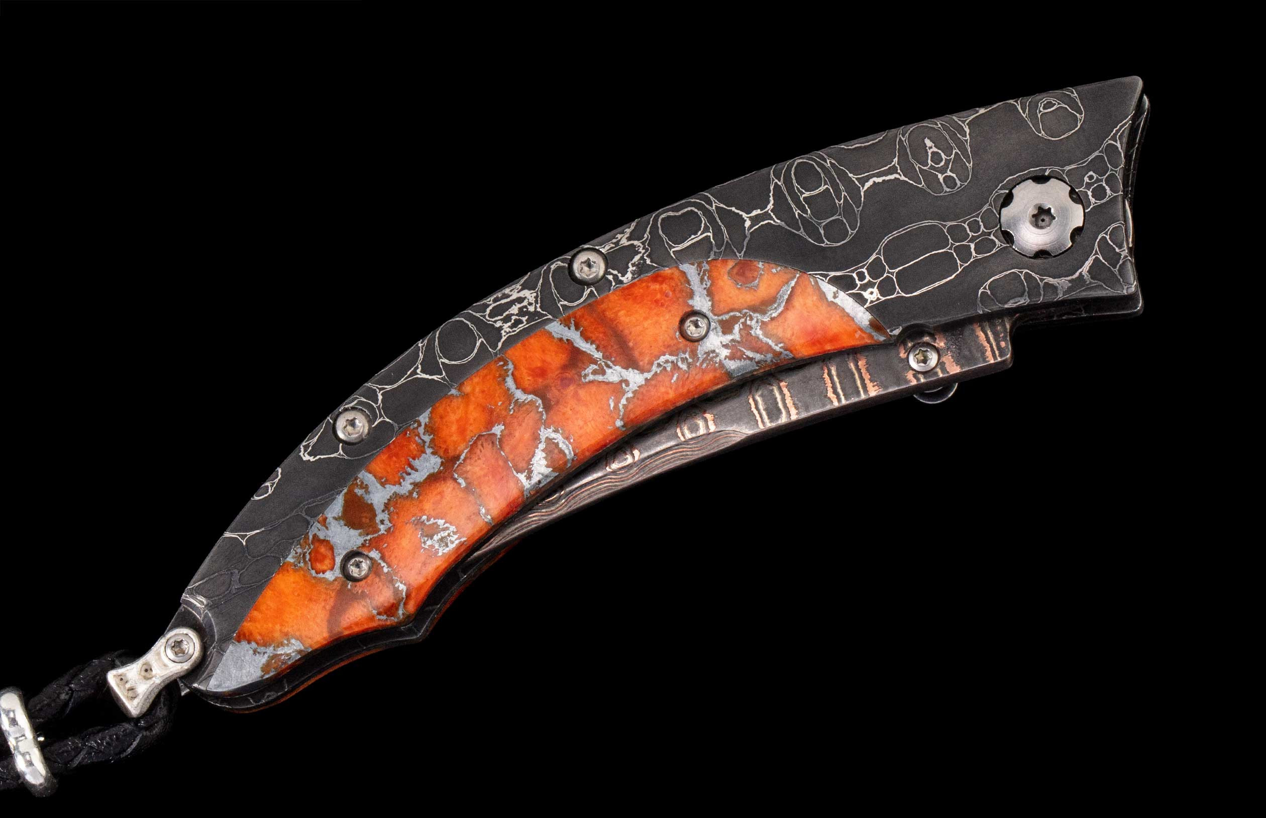 The Persian ‘Reef Madness’ features a beautiful frame in hand-forged ‘X-Out’ damascus by Chad Nichols, inlaid with Zinc Matrix apple coral. The blade is ‘Copper Wave’ damascus with an extra-strong core in VG-5. The one-hand button lock and the thumb stud are set with white topaz gemstones. The Persian is an elegant synthesis of dramatic lines, graceful curves, and exquisite materials. A bold interpretation of a timeless design, the ‘Aspen’ features the exotic materials, and superlative metals that are the hallmark of William Henry’s collections; a timeless heirloom to be proudly worn and used for a lifetime.