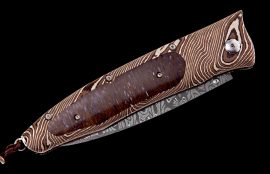 The Gentac ‘Cedar’ features a beautiful frame in Twist mokume gane hand forged by Mike Sakmar, inlaid with a beautiful piece of fossil Russian Cedar. The blade is ‘Hornets Nest’ damascus hand forged by Mike Norris; the one-hand button lock and the thumb stud are set with smoky quartz gemstones. An exceptional design that offers rigorous performance in a sleek, comfortable knife, the Gentac is also the perfect canvas to showcase William Henry’s range of exotic materials and techniques. The ‘Anchorage’ features some of the exotic materials and forged metals that are the hallmark of William Henry’s collections; a distinctive personality statement to be worn and used for a lifetime.