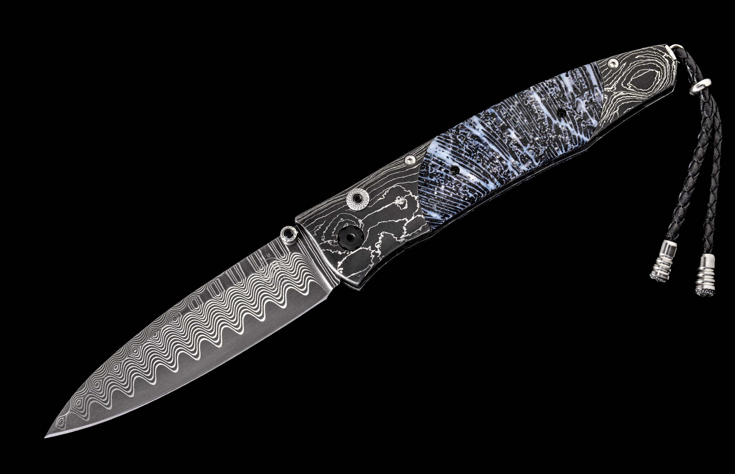 The Gentac ‘Grey Dawn’ features a beautiful frame in etched ‘T-Rex’ damascus by Delbert Ealy, inlaid with fossil brain coral. The blade is William Henry’s ‘Wave’ damascus with VG-10 core; the one-hand button lock and the thumb stud are set with spinel gemstones. An exceptional design that offers rigorous performance in a sleek, comfortable knife, the Gentac is also the perfect canvas to showcase William Henry’s range of exotic materials and techniques. The ‘Grey Dawn’ features a perfect balance between elegance, function, artistry and exotic materials; a distinctive personality statement to be worn and used for a lifetime.