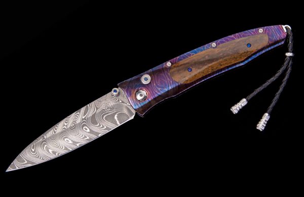 The Gentac ‘Rhino’ features a beautiful frame in hand-forged and heat-blued ‘Rolling Rock’ damascus by Chad Nichols, inlaid with 10,000 year-old fossil Woolly Rhinoceros bone. The blade is hand-forged ‘Boomerang’ damascus by Chad Nichols; the one-hand button lock and the thumb stud are set with sapphires. An exceptional design that offers rigorous performance in a sleek, comfortable knife, the Gentac is also the perfect canvas to showcase William Henry’s range of exotic materials and techniques. The ‘Rhino’ features some of the exotic materials and forged metals that are the hallmark of William Henry’s collections; a distinctive personality statement to be worn and used for a lifetime.