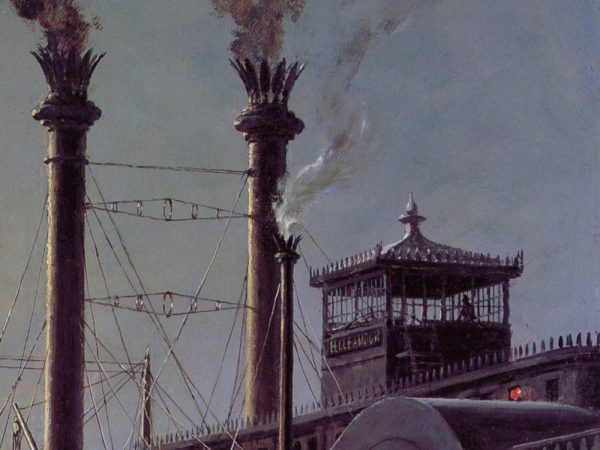 Here is a view of the vessel, Belle Amour, taking on a few bales of cotton at the levee beside the town of Bayou Sara. The viewer is invited to come aboard via the reflection in the cartwheel tracks and over the extended stage.