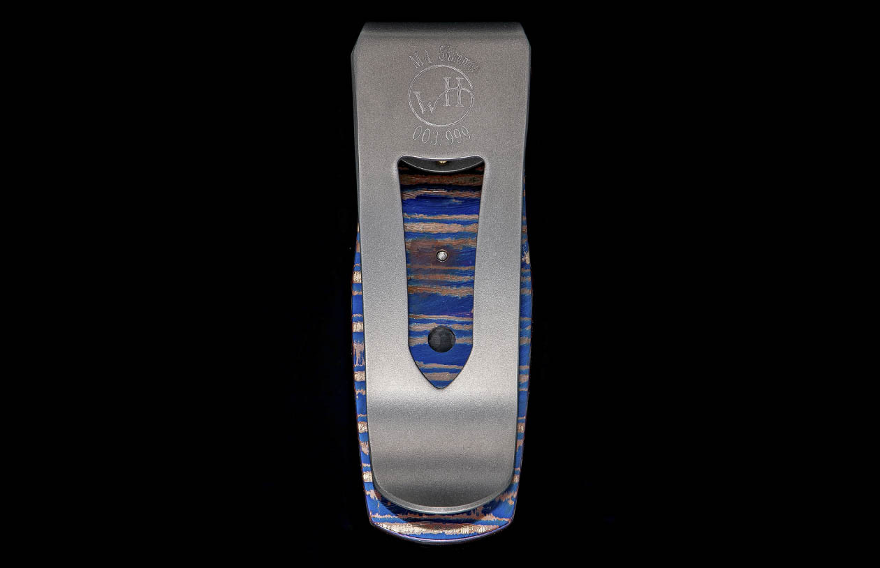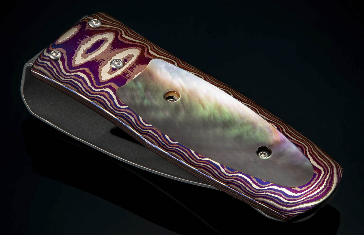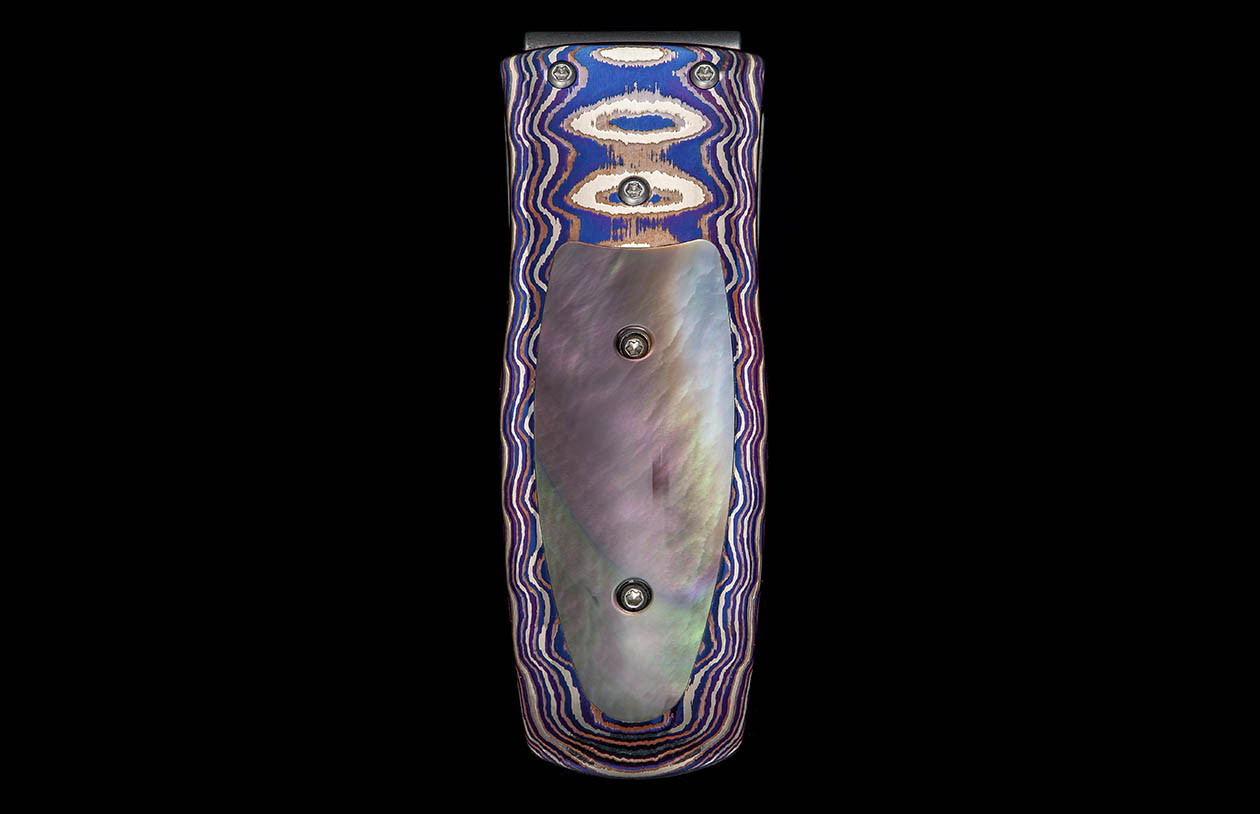The Pharaoh ‘Shimmer’ features a frame in heat-colored ‘Wave’ mokume, inlaid with black lip pearl.The clip is machined and blast-polished from tempered stainless steel, with a beautiful engraving bright cut against the matte-finished background.