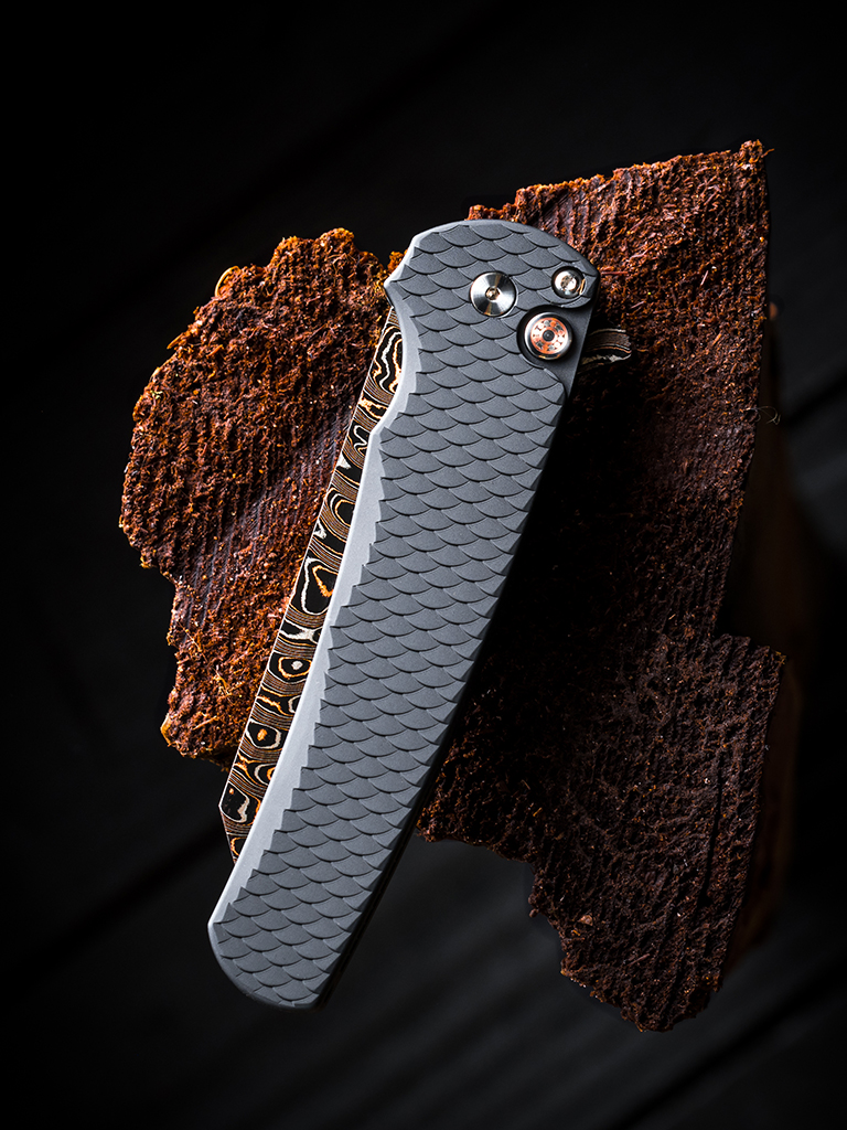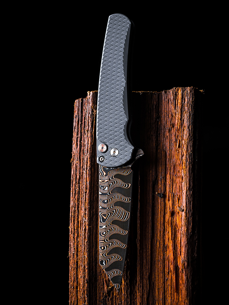 The 2026 Malibu Flipper Custom 004 features a black dragon scale aluminum handle, BakerForge Elite Coppermai Ripple damascus Reverse Tanto Blade, mosaic pin button, and satin hardware, with black clip. Due to the delicate nature of Carbon Damascus Etching, please use caution when wiping and using the blade. The