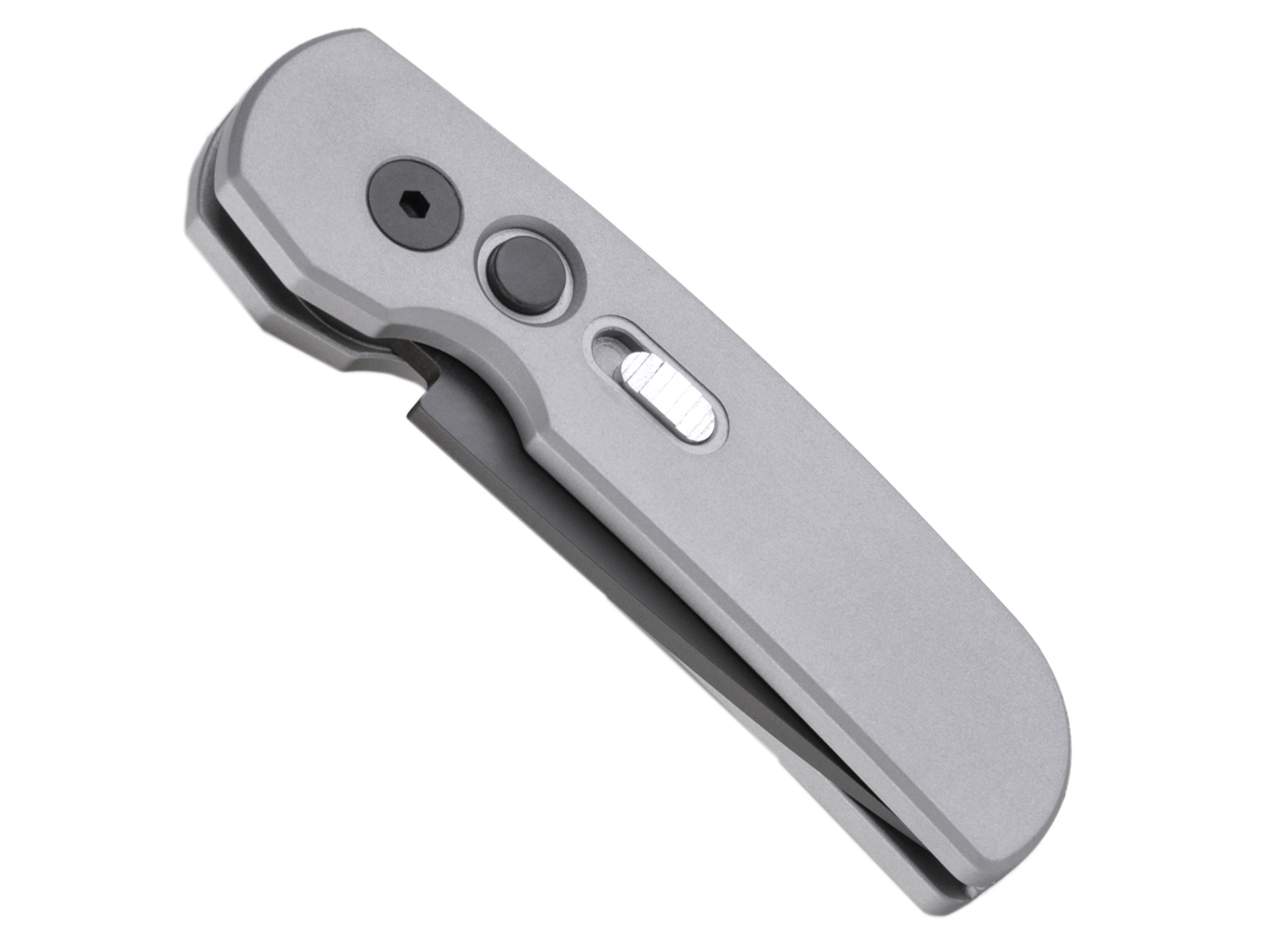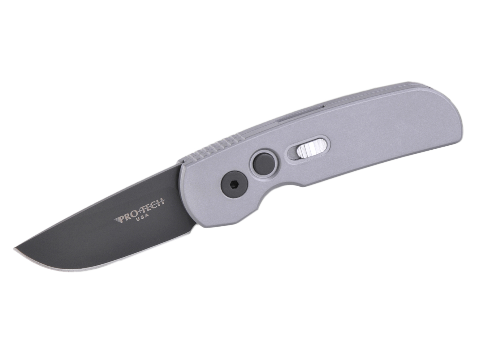 Anodized silver aluminum handles with black DLC coated plain edge blade. ProTech’s newest small auto knife packed with Big Knife features!