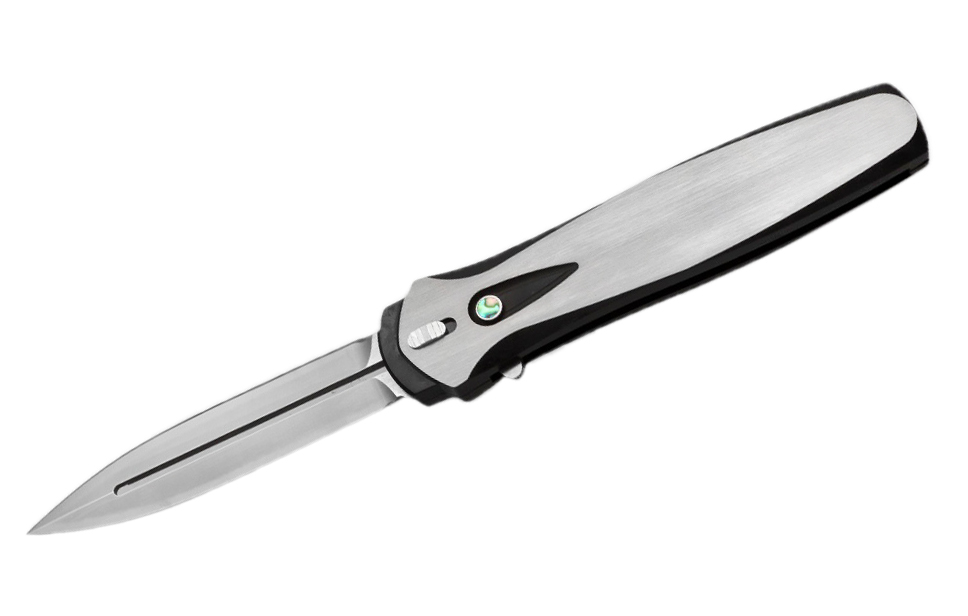 Solid 416 steel frame with awesome 2-tone DLC Black and Satin finish, a mother of pearl push button, and a satin blade. This knife is an individually serial numbered limited edition. Awesome single action out the front automatic knife. The Dark Angel delivers constant spring tension in an out the front auto knife in a very stylish and lightweight package. The pocket clip for the Dark Angel is a newly designed custom part. This clip folds over itself to allow for a deep “hidden” in the pocket effect.
