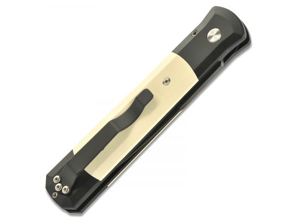 Black aluminum handle, ivory micarta inlays, black finish blade with plain edge. This awesome 4″ blade auto knife represents the influence of original Italian “Stilletto” style auto knife and Pro-Tech’s modern coil spring precision. The Godfather production auto knives feature T6-6061 aluminum handles that are machined from solid black stock. Production Godfather blades are four inches in length and generally 154-CM stainless steel that are heat treated to 59RC.