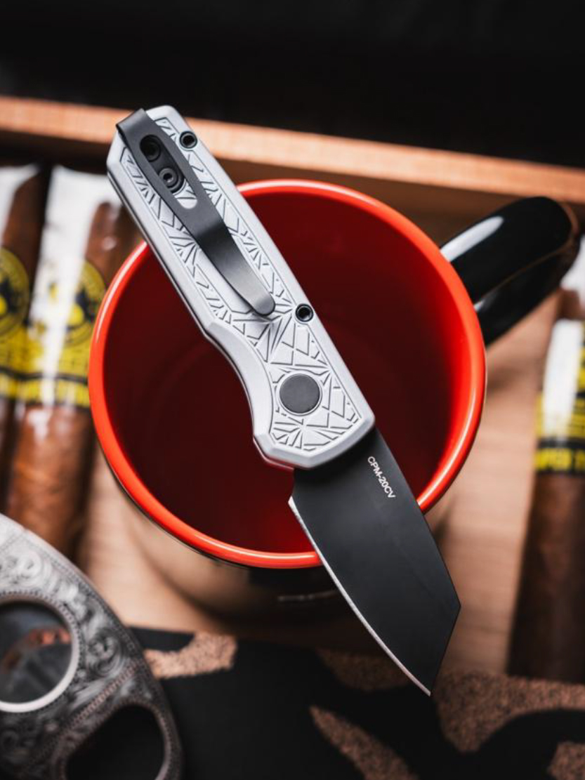 The Runt 5203 Grey NEXUS features grey anodized aluminum handles, DLC coated reverse tanto blade made in Black CPM-20CV steel, all black hardware, and black mini deep carry clip.