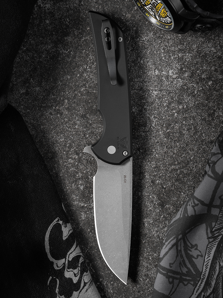The Mordax Flipper MX101-AW 20CV features a solid black aluminum handle, acid wash 20-CV steel drop point blade with plain edge, blasted hardware, and black deep-carry pocket clip.