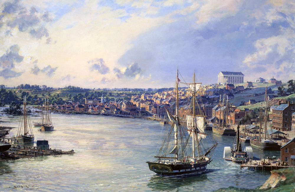 The arsenal of the Confederacy, it was Richmond’s strength in manufacturing that was the key to the South’s successes in the Civil War. The Tredegar Iron Works, downriver from the viewpoint of this painting, produced canons and all necessary munitions and arms for the conflict.