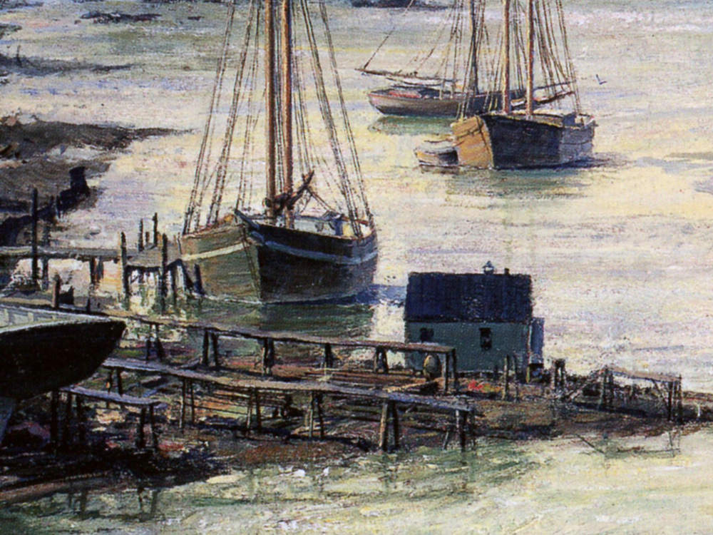 In this scene, based on a collection of several very fine contemporary etchings, a packet brig arrives with immigrants at a dock just below Rocketts Landing, a mile below the city. The paddle tug boat is about to cast off the towline prior to nudging the vessel to her berth.