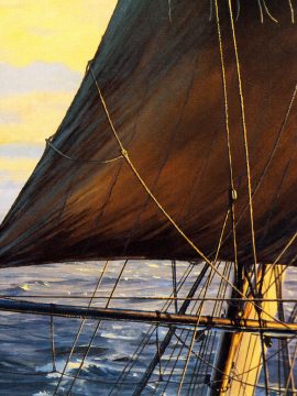 Cover art for Patrick O’Brian’s Aubrey-Maturin series book. Sunset in the Indian Ocean, viewed from the upper masts of HMS Otter. The Otter, a ship-sloop, was a relatively small vessel with 18 guns. Beyond her are the larger frigates Boadicea, Sirius, and Nereide. All the ships are busy shortening sail and taking in their topgallants – a common precaution at nightfall if squalls were expected.