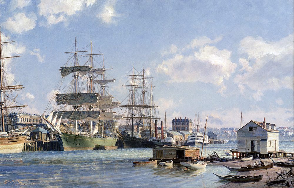 The “belle of the ball” here is the celebrated Aberdeen built clipper “Thermopylae” which having brought a cargo of rice from Saigon, arrived in port on 26th June, 1891, this presented us with a magnificent focal point. As in the case of her rival in the China tea trade, the famous “Cutty Sark”, and also the “Titania” and the “Taeping”, she was of composite construction (elm and teak planking on iron frames). Her most prominent identifying characteristic however, was that her hull color was green, making her the “prettiest vessel ever” under sail.